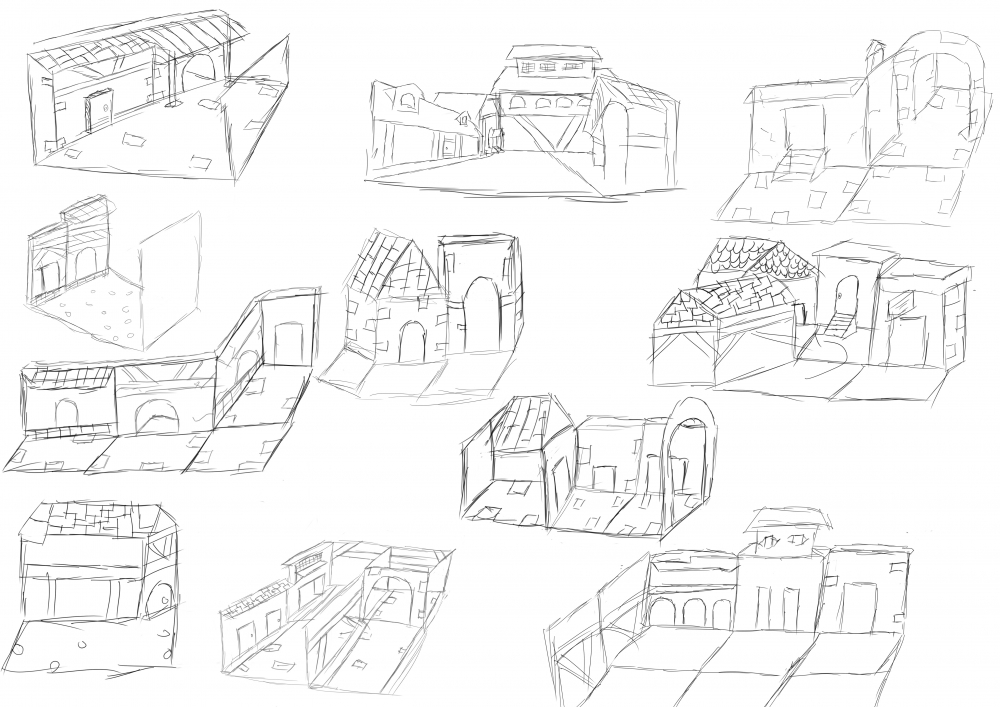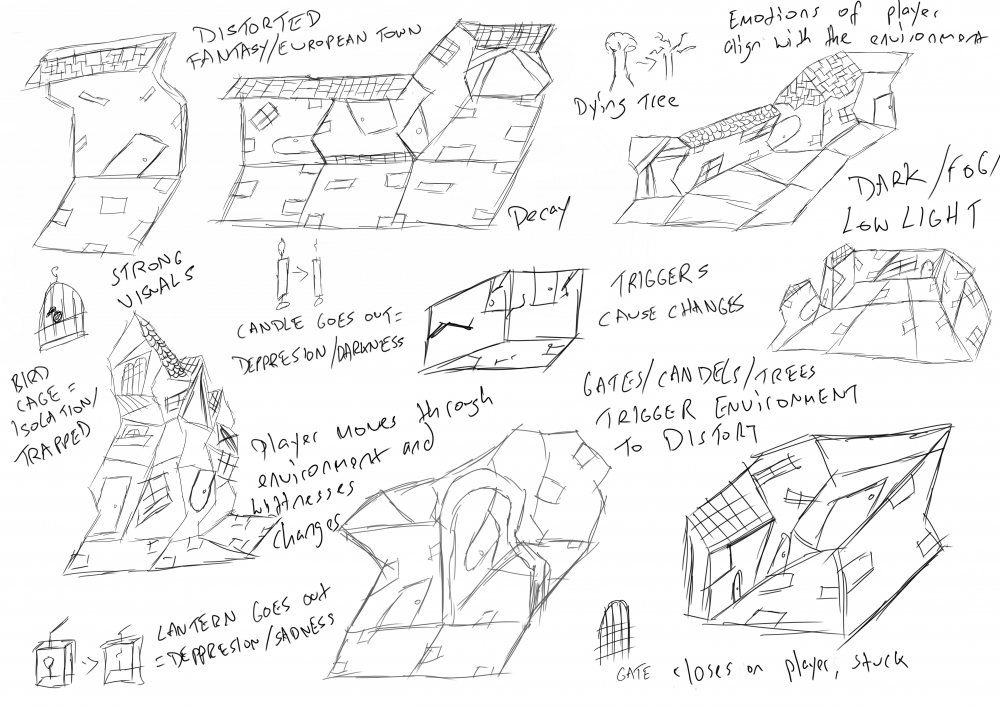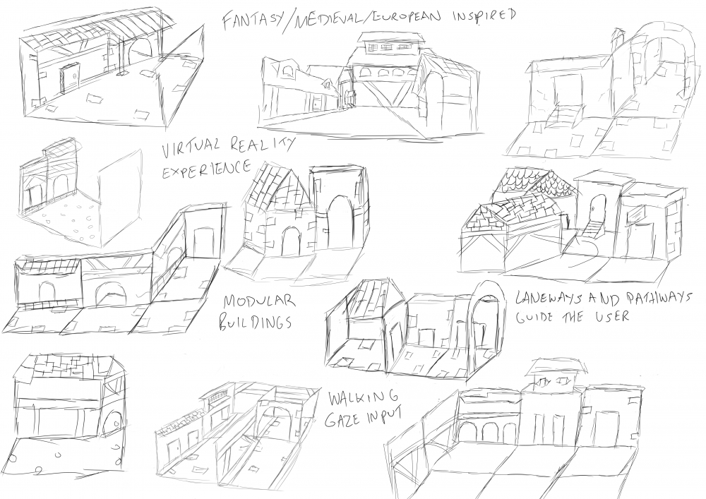 My plan is to create a functioning prototype of my virtual reality experience 'A Hidden World'. In completing these sketches I have decided to use modular modeling techniques to create a fantasy/ European style town that will distort around the user based on the trigger they encounter within the environment i.e. candle going out, dying tree, gate etc.