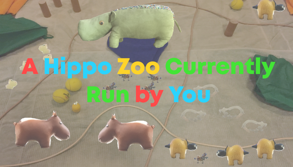 In response to the theme of found objects I created a hippo stamp toy in Unity using photos of my sister's hippo collection. By giving the player the freedom to arrange the various hippos in their own zoo, I am able to emphasize the absurd disconnect between a vast toy collection and the endangered animal they represent. I am inspired by the work of the LovePunks https://vimeo.com/40640424 that use edited photos to play off and reconceptualise their environment and themselves in exaggerated or fantastical ways.