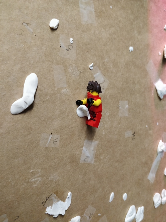 After walking for 30 mins outside the university I saw the hardrock rock climbing facility on franklin street and decided to use the materials in the studio to make a rock climbing surface. Found some blue-tac, cardboard piece and a lego to play the part.