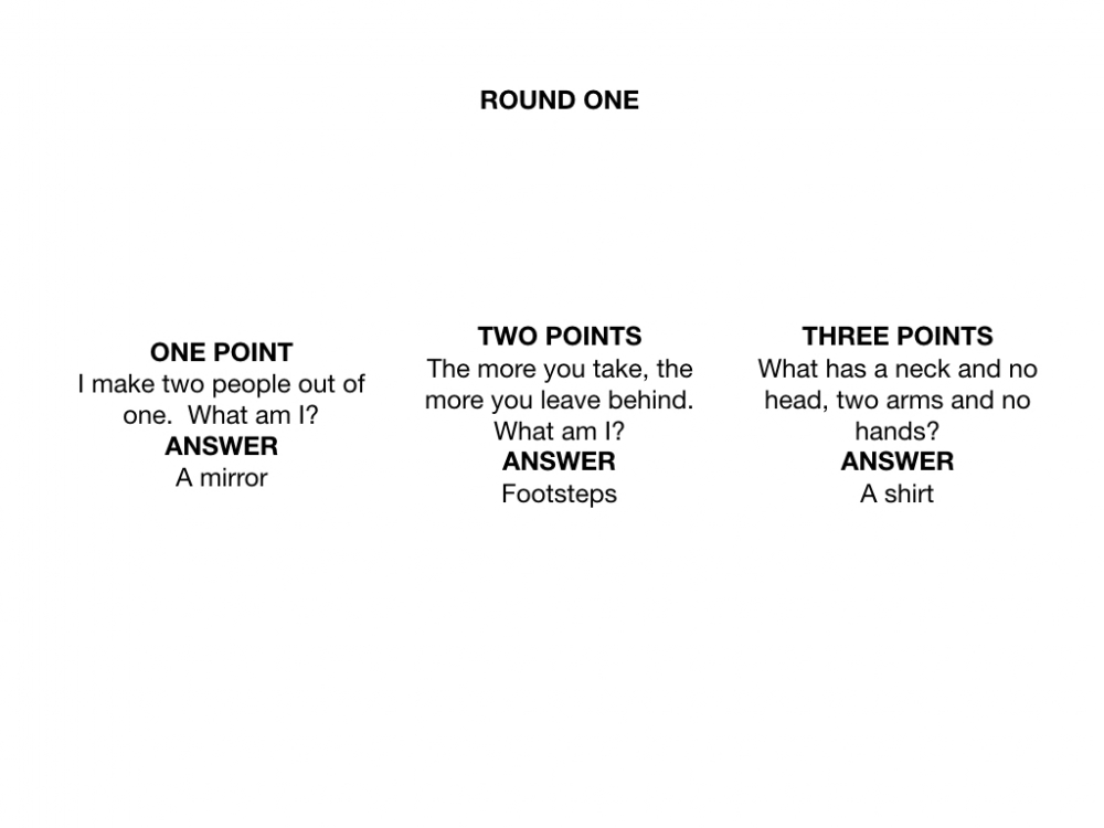 Collating various riddles from riddles.com, I designed a game that works with two teams working together to win. The first team is the group of observers, and the second team is the single person subject. This subject team could be expanded to more players to make the game less difficult.