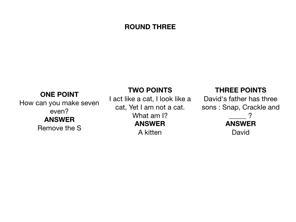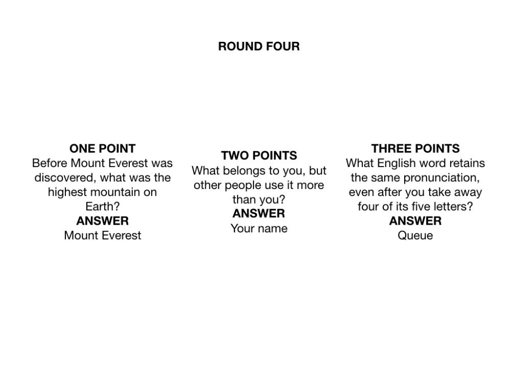 Each round the observers are presented with three riddles along with their answers, sorted by difficulty (easy riddles equal one point, medium riddles equal two points and difficult riddles equal three points). The observers must decide which riddle to give to the subject, balancing their knowledge of the subject while trying to maximise their points acquired.