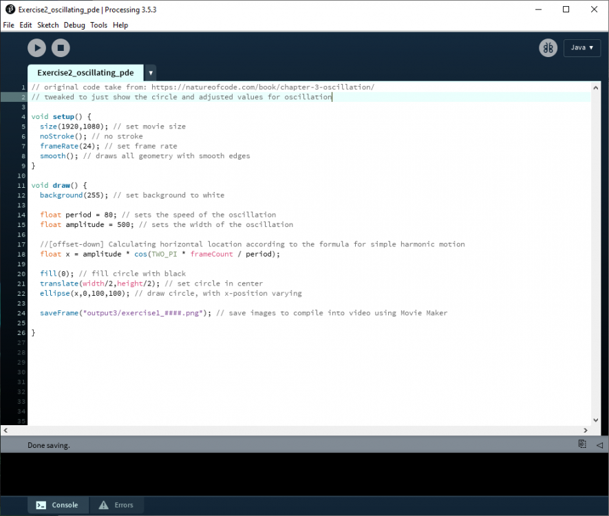 After Nick showed us the basics on how to use Toon Boom Harmony, I gave it a go but got frustrated with trying to animate a polygon on a curved motion path (thanks Ben for all your help though!). For some reason I could not get it animating smoothly, and it would pause briefly at certain points along the path. At this point, I re-evaluated what I was doing, and decided to switch to animating in Processing instead, as I wanted to focus on using creative coding techniques to animate my project iterations for Illusion of Life. I thought this would be a good opportunity to learn and practice Processing.