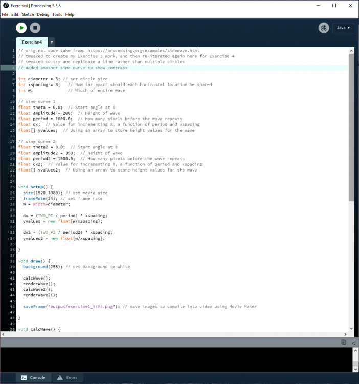 As it was only my third or fourth time using Processing, I ran into even more issues just trying to animate a simple circle across the page on a curved path. The whole process ended up being a frustrating experience, maybe because programming isn't my background. There were many moments where I wanted to give up and just do it in After Effects, which I'm more familiar with. But I stuck at it, and went through many examples and references on the Processing website. There were certain things which I wanted to implement but couldn't figure out how to do, such as: