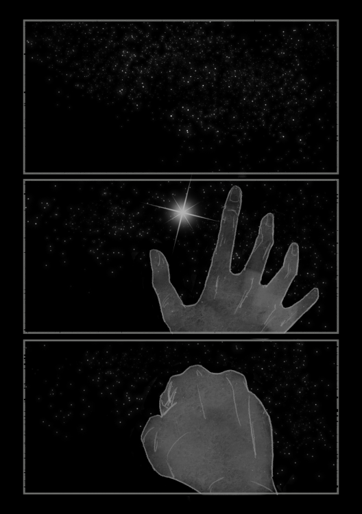 Lighting is not only suggesting the passing of time-shifts but also can create atmosphere. Here I want to try to use natural to render the lonely atmosphere. In my little comic, firstly I showed the passage of time through the change of light outside the window, from day to night. At the same time the overall tone of the picture is dark, the light from the window shines into the room, complete with reflections on the floor and walls, we can see that the room is rather empty. At night, there is no light source in the room, the only thing that is glowing is the eyes of the protagonist. There is light in her eyes since she is staring at the stars outside window. She reached out her hand to the brightest star. Clenching her fist tightly, as if she had grabbed the star. Is the light only the reflection of the stars? Here I have used metaphors, comparing light to hope, or some kind of good expectation.