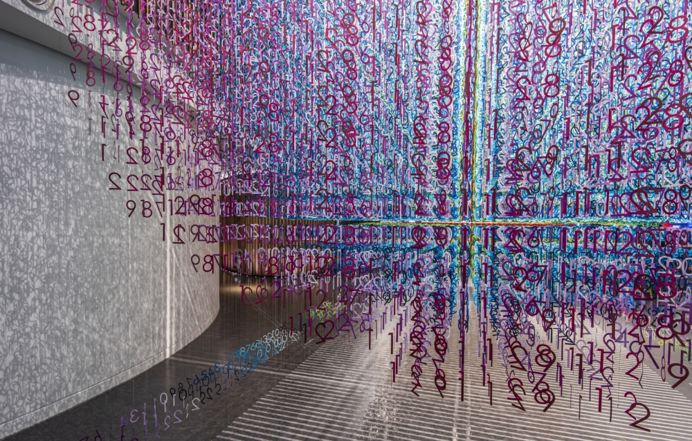 “Slices of Time” expresses the past, the now and the future through 168,000 small numbers composing 120 “slices” of time, hanged in the space, as a round representation of the earth floating. Composed of 100 layers of numbers in 100 shades of colors and 20 layers of numbers in white, the installation visualizes the next 100 years to come (2020 to 2119) and the past 20 years (2000 to 2019) represented in white.