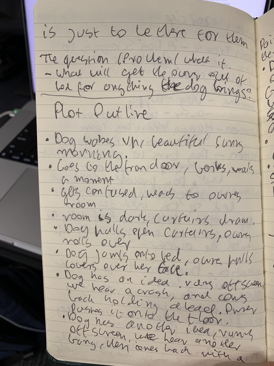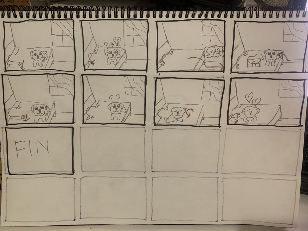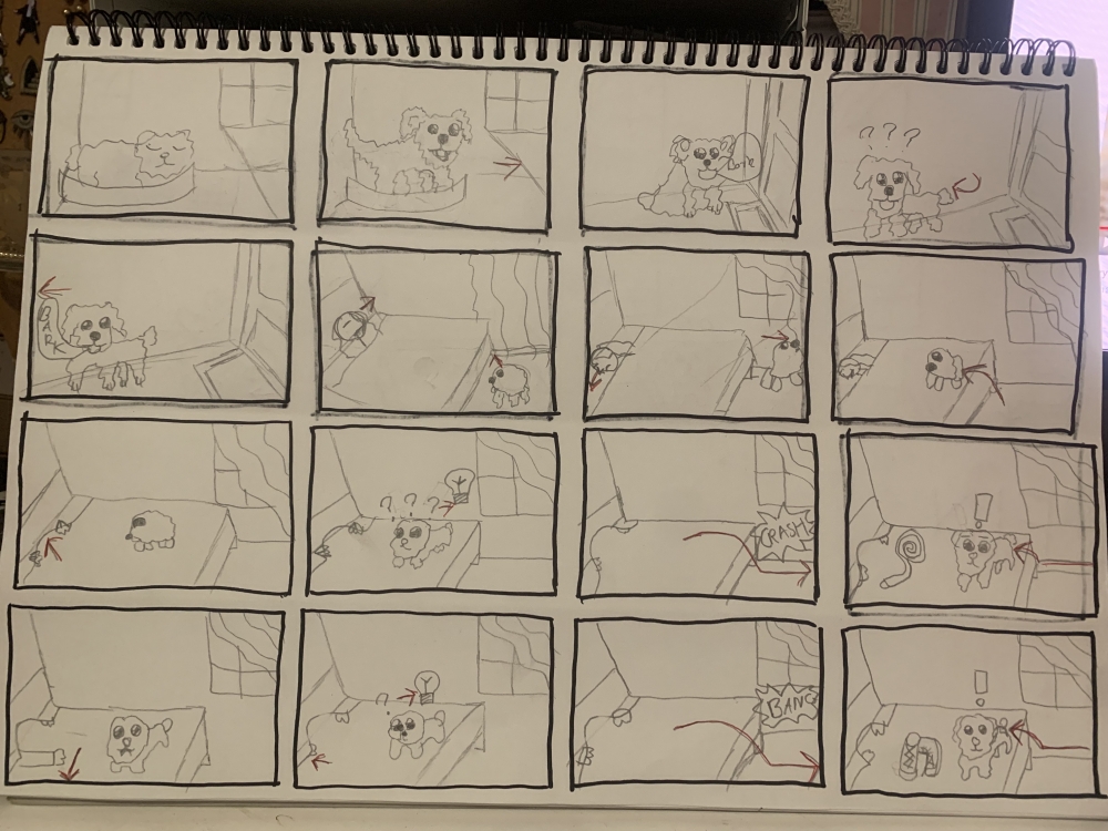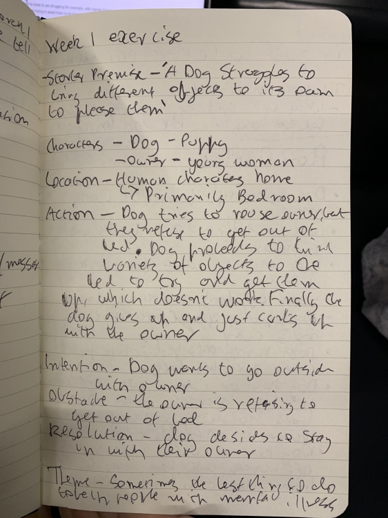 For this exercise I started with the story premise that I contributed to the premise exercise, which was ‘ a dog struggles to bring different objects to its owner to please them’. I then expanded on the premise to describe what the building blocks of the story would be. For Characters there would be two, a dog, and its owner, a young woman.. The Setting of the story would be inside of a house, with the majority of the action taking place in the owner’s bedroom. In terms of Action, the story would begin with the dog waking up, and wanting to go outside. The dog tries to rouse its owner, but she refuses to get out of bed. The dog proceeds to bring objects to its owner, to try and prompt her to take it for a walk; first a lead, then a pair of shoes, then a backpack. After the owner discards each of these objects in turn, the dog gives up, and curls up on the bed next to her. The story would end with the owner reaching down to hug the dog, who happily accepts this.