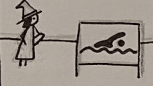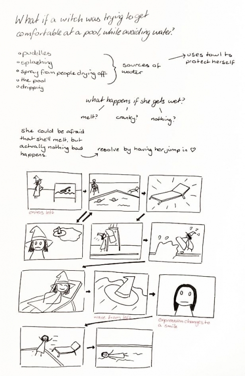 This week we focused on telling a story through a character, location and an interaction. My focus was to use metaphor and semiotics to drive the story telling. By using symbolism—the puddle with a hat in it— I also tried to show that the witch was afraid the water would melt her. I chose to create a storyboard as it allowed me to create a short gif and get a feeling of how the animation would flow.