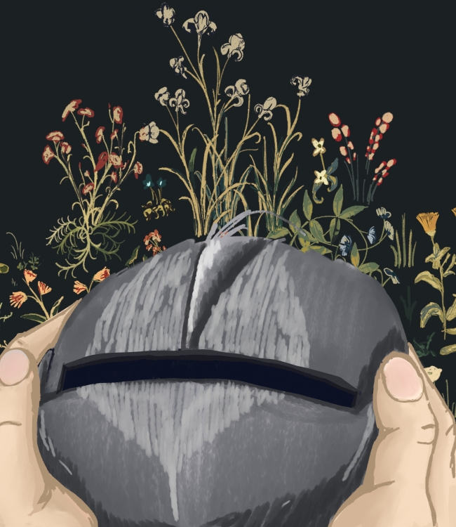 The first shot of this animation focuses on emulating the use of light in the original tapestry, portraying the flora in the same way - flat, but with shadows and highlights. This establishes the world the story is in is the same as the tapestry which will be shown to the audience beforehand. The knights helmet is then shown cradled in the character’s hands, and the light reflects across it. This manipulation of light allows the work to direct the viewer’s focus in a way the original artwork couldn’t, but still appears to take place within the world of the tapestry. It also implies a moment of reflection or hesitation, as all that is shown in frame is the character’s hands and the helmet, the light slowing the moment and implying a greater consideration of these two objects.