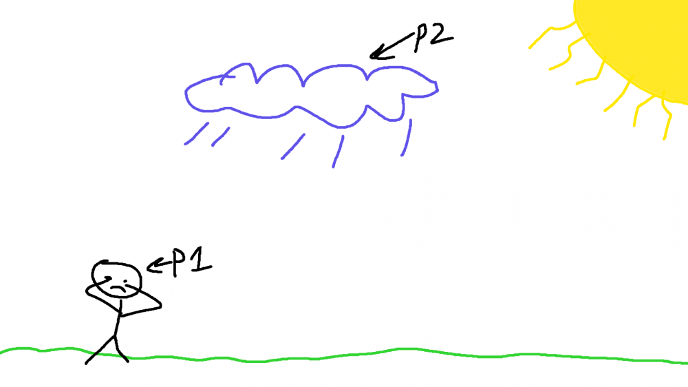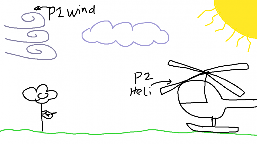 With the help of Kate after discussing the premise. I am thinking of a game idea as shown in my drawings below in Fig.1 and Fig.2. In Fig.1, two players will be playing the game and one of them controls the human player where they have to go into the sunlight to dry themself from the rain that they have to avoid. The second player tries to block the light and has to drench the first player with rain. In Fig.2, there is a sunflower which needs light to grow, but the first player blocks the sunlight with their clouds by controlling the wind. The second player gets to help them by using a helicopter to push the clouds away by using the propellers to generate their wind.