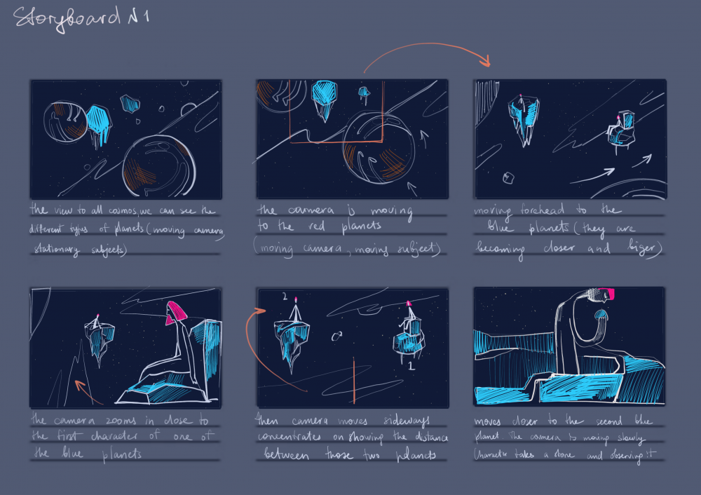 In the previous submission for this theme I started to write a script and for this week I created a storyboard for that finished part. Also, for this week Im going to continue the story in storyboard and draw an illustration which shows how “orange planets” will look like (where people are fully interconnected with their planets).