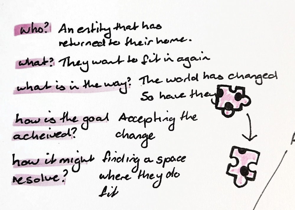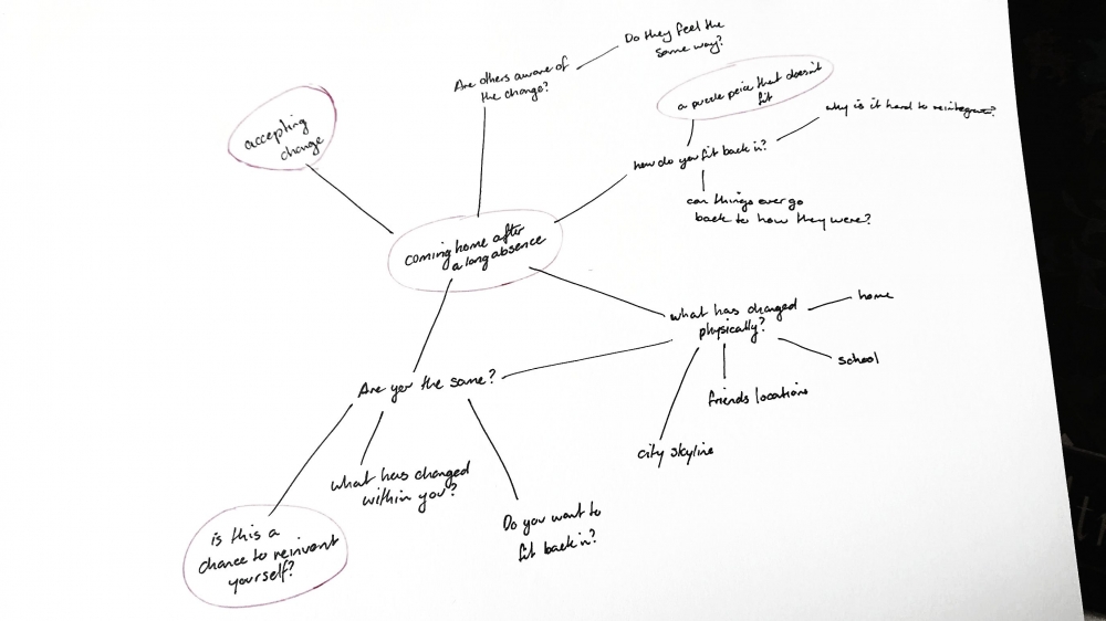 For week 2 we looked at the various ways a story can be created. I took the concept of returning to your home, and began building ideas with a mind map around the fact that things will inevitably change if you’re away long enough.
