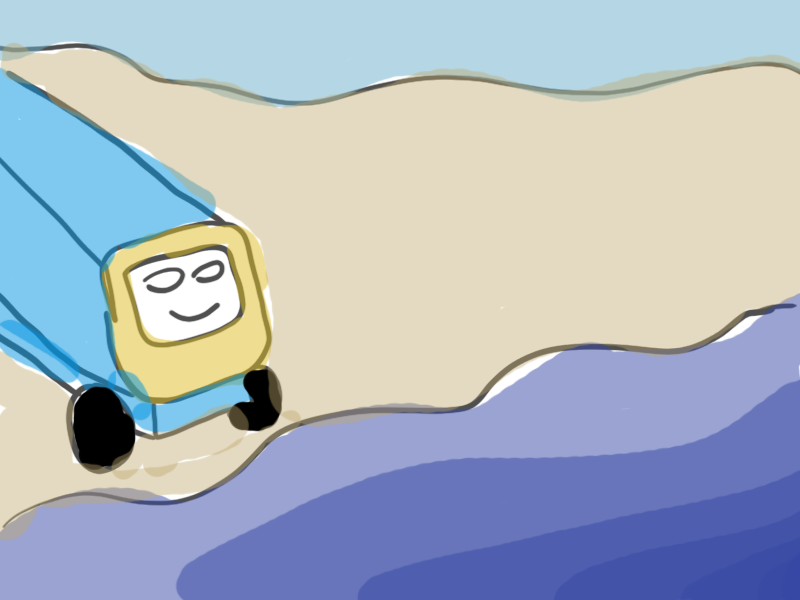 A train is going through the motions of its daily life; waking up in a cold grey depot, surrounded by other trains; travelling its route through a dull urban landscape, and then returning home to rest before repeating the cycle. Its one daily highlight is when part of its route takes it briefly out of the suburbs, and across a cliff that gives it a view of the ocean. One day, the train’s controller assigns it to a new route, one which has no such natural views, or any respite from the dullness of suburbia. After one day of working this new route, the train decides it can’t just go on like it has been. The train travels out to the sea, and derails itself, sliding down the cliff to land on the beach that it had spent so much time wistfully gazing at. The story ends with the train content in its new environment.