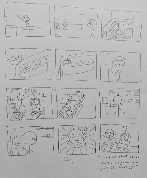 I made a storyboard with 12 panels, which allowed me to tell the story with cartoony figures and dramatic facial expressions. I was also able to create a comic effect to show emotions by zooming in and out of the frame.