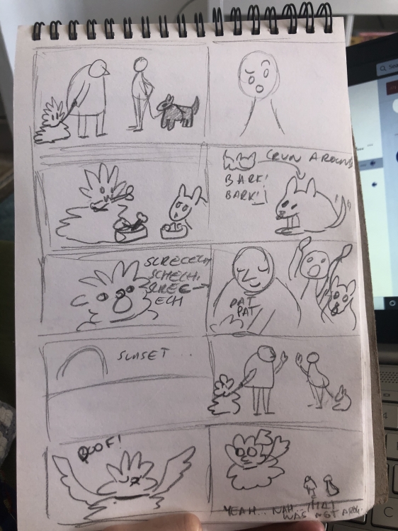 This work focuses only exploring character through dialogue. In my group we used the premise quote ‘Yeah...nah, that isn’t a dog,” to create a short story. I then drew thumbnail sketches, and made this character sketch. I also redrew the final frame to show the scene with the dialogue.