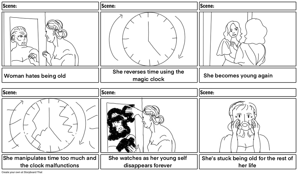 When I thought of time, the first thing that popped up in my mind was Ageing, how we all surrender to the fact that we keep getting older as time goes by. I came up with the following premise: A woman uses a magic clock to rewind time in order to stay young.