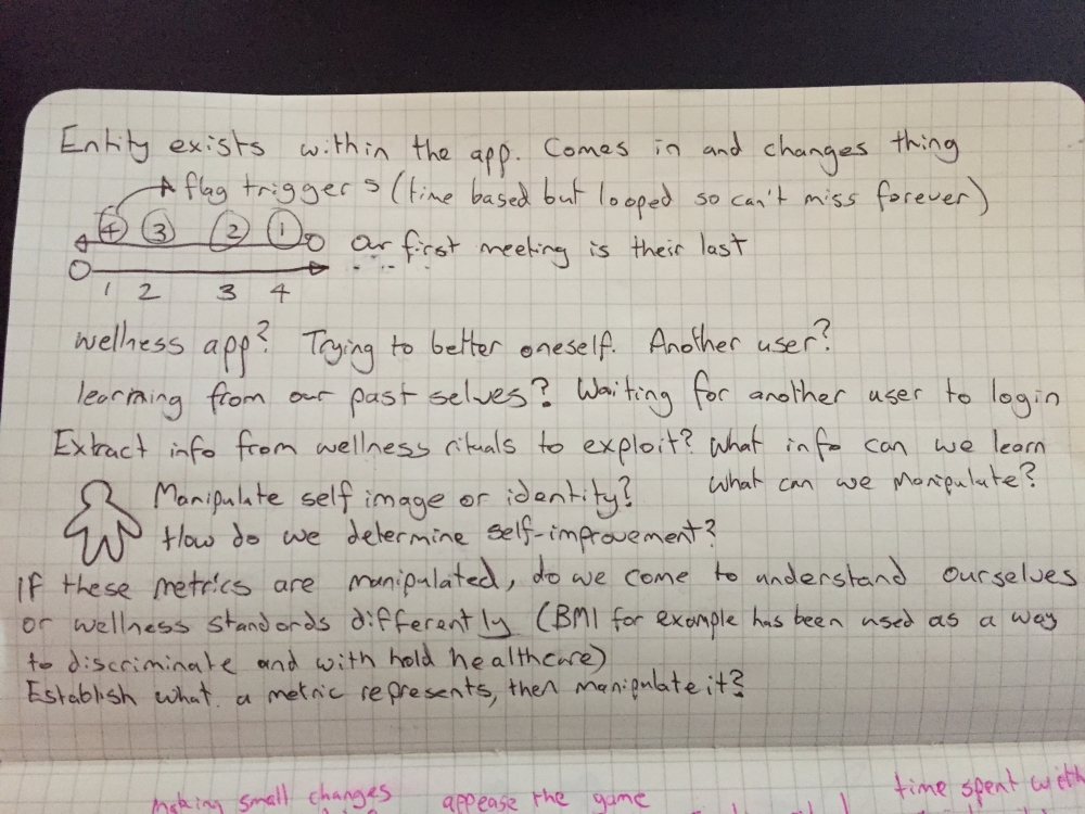 One Idea I explored a little deeper is a short game that first appears as a wellness app that promotes habitual wellbeing practices. The app asks that you interact with it on a daily basis to help build mindfulness rituals into your everyday life. As you begin to participate in the daily activities, you start to notice an unsettling change in the tone as the app evaluates you based on quantitative data. Soon you become aware of another entity or user in the app that seemingly manipulates your data when you’re not around. Once you have learnt the patterns and behaviour of this entity, you can start to plan your interactions to intercept or avoid them.