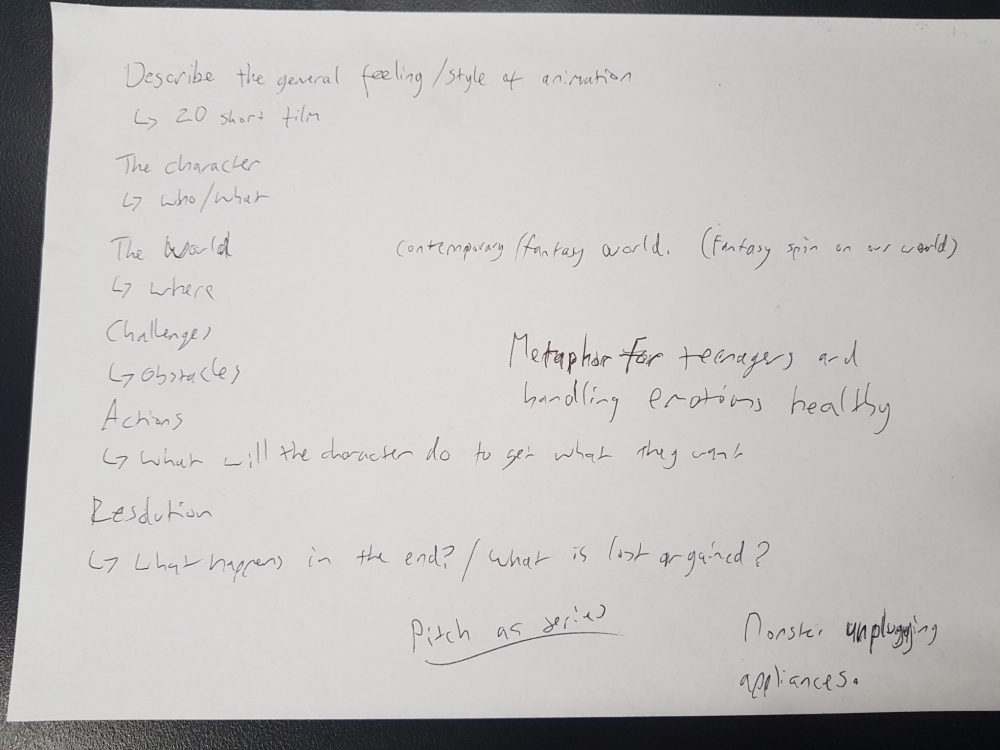 The best feedback I got for my pitch was from Nicholas Flanders-Farmer summarising the concept as ‘A visualisation of teenagers learning to deal with their emotions in healthy ways.’ I was very relieved after all my rambling that someone came to that conclusion. During the development of this concept that idea has been a focus of mine. The monsters are designed to be like toddlers. They suddenly exist in the world, they have emotions but don’t have any way to speak or communicate what they are feeling, and so they lash out and throw tantrums. I wanted to be specific that the best way for the characters to deal with a monster is by calming it down and giving it space to express itself safely. When I’m focusing on writing a pitch I tend to put aside these thematic ideas as I focus on what is the medium, target audience, and why is the main character engaging.