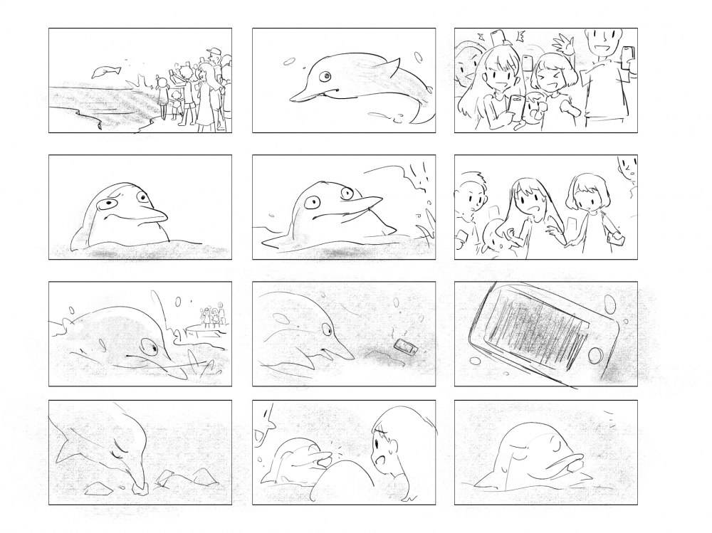 story:A dolphin lives near the sea. Watching the people appear on the shore is what he is most interested in. The dolphin treats them like his pets. But one day, these "pets" would pull out a shiny rectangular box and aim it at him. The dolphin is angry and confused. One day, a girl visiting him accidentally dropped the glitter box into the water. Dolphin dives into the water, sees the box flashes then turns black. The dolphin looks at the box with disdain. He picks up a stone and swims over to the girl, who looks confused as the others laugh and put down their "bad toys". The dolphin is very proud that he has found suitable toys for his "pets".