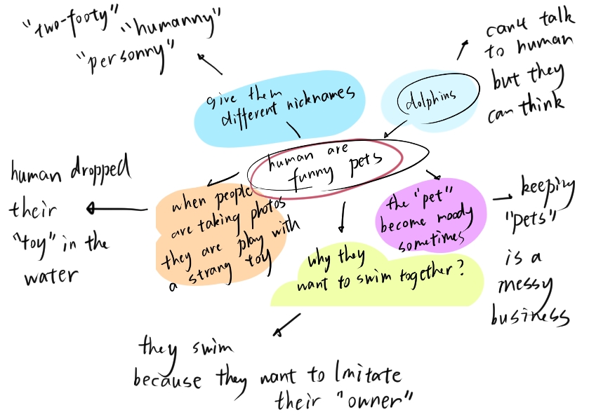 This week, I wrote a story about a non-human protagonist by researching characters, places, and motivations. Humans taking pictures of the dolphin misconstrued him as humans focusing on playing with their toys and being disgusted by him, so he gives them his toy. The animal character can think but is not from the human's perspective. Therefore, it is important for the audience to understand his motivation from his perspective. The scene switching and transition play an important role. If the audience can not understand the motivation of the dolphin in the story but take the human's perspective, it may be confused or difficult to accept the ending.