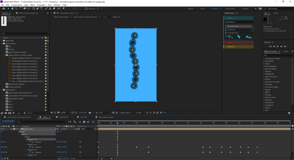I also got really stuck on how to get the plates neck to look right as suggested by Kate (bigger -> smaller -> bigger when the head moves forward). Both the Puppet Pin and Rubberhose tools didn't allow for translations in 3D space (the Z plane). I tried bending it using the 3D Geometry options and the Cylinder CC effect, but both didn't give me the effect I wanted. In the end, I faked it by using the Bezier Warp effect to manually bend the plates. Kate also gave me some more suggestions on how to tweak the animation in my consultation session this week, which I'll try and incorporate in my next iteration.