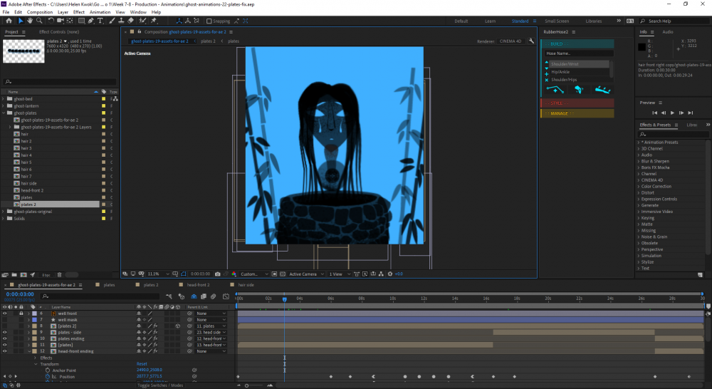 After having done my animation test in Week 4, Kate gave me some feedback on how to improve on the animation, such as: adding a mask in front of the well, so it looks like the ghost is emerging from it; making the hair flow better; have the hair push in then out when the ghost emerges; include more pauses in the animation; and fix the neck when it comes forward. I was also able to put the skills I learnt whilst developing the animation of the ghost in the lantern here too, such as using the Wave Warp effect for the hair (originally used to create fire in the Oiwa animation), and also the looping expression to make the hair loop continuously.