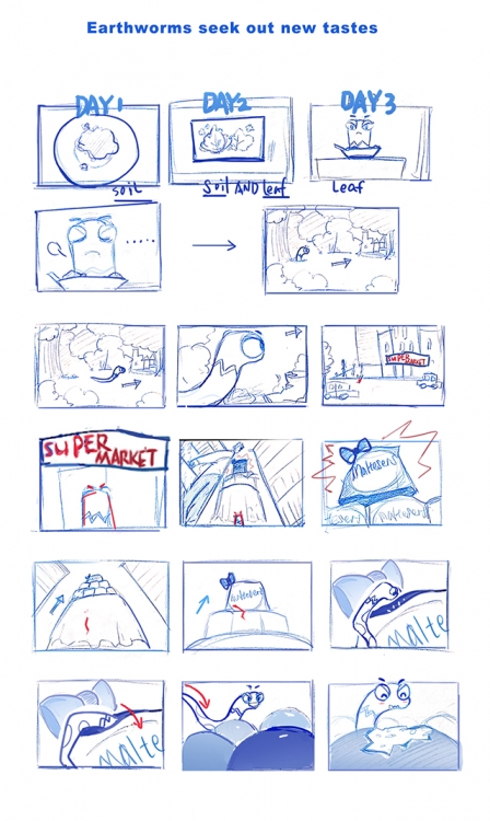 I chose to express this concept in a storyboard. To describe an earthworm, tired of the daily monotony of food.Eating leaves and soil every day that makes it feel boring. so the earthworm Duo wanted to find a new flavor. He gets out of the grass, the road, and the crowd. He went into the supermarket and saw the red bag (Maltesers) that be placed in a beautiful place. He climbed into the bag and tasted the new treat.