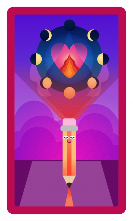 In the context of my own story of my practice so far I interpreted it as the weird relationship I have with institutionalised learning. I took a long time to ‘settle’ into any one field of study. My undergrad was a long and winding road from starting out in advertising to graphic design to law then to illustration. This was offset by my own experiential learning with traditional painting - my knowledge in watercolour, gouache and mural painting etc have largely been through trial and error. My total collective knowledge now is a steady balance between something formally taught to me and something I intuitively learned myself. Regardless, any institutionalised learning has always been guided by intuitive creativity. In the illustration/GIF I tried to portray this by creating two symbols - one for the High Priestess and one for the Hierophant - fuelling the pencil and the energy of the pencil swings back and forth between the two. In the creation of these symbols I thought about the symbols and colours traditionally used in the tarot imagery and carried some of these associations across.