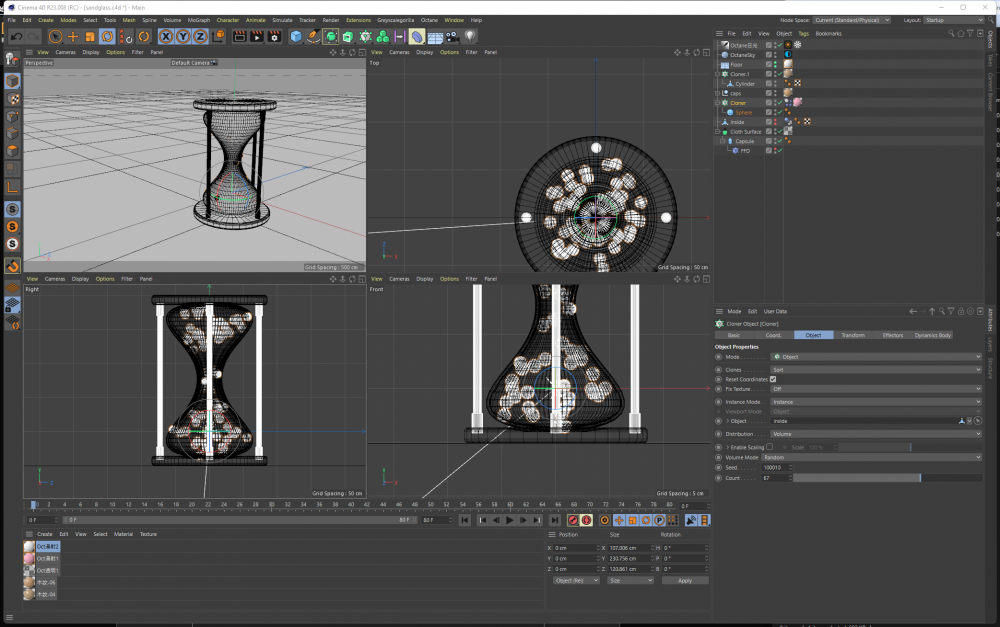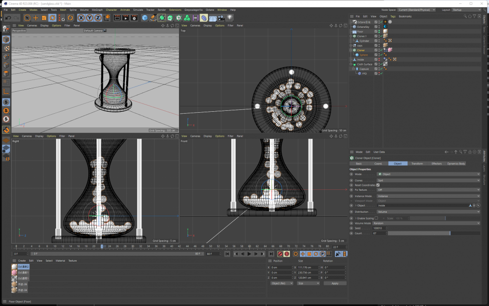 This is actually my first time using 3d modeling software c4d for modeling and animation design. Although this is a very simple model, it includes a lot of details. For example, how to put cloth surface in c4d to add thickness to glass, the collision motion of the sphere, the glitching effect in AE, etc.