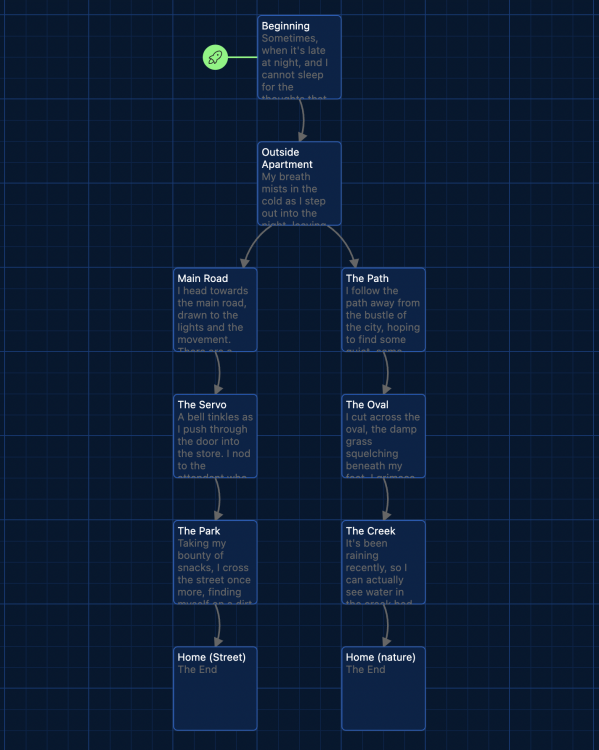 For this week's response I wrote a short piece of hypertext fiction using Twine, chronicling a solitary late night walk, pieced together from memories of many different walks and experiences. The piece explores both the physical locations that the character wanders through, as well as the memories and thoughts that these places evoke. There are moments where the narrative branches, with a major choice at the beginning splitting the narrative into two halves, but most of the piece is relatively linear. I wanted to use the hyperlinks to make the story more spatial, with each location that the character passes through being a separate moment that the reader experiences.