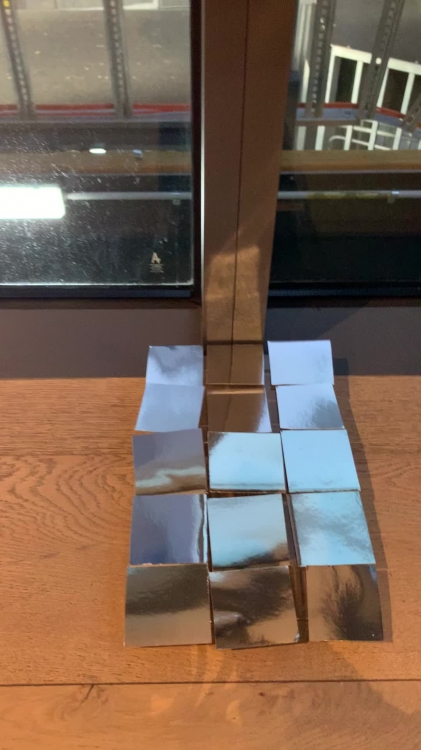 After the first and second tests, I would like to engage the emotional connections within the play stronger. Inspired by Daniel Rozin who uses mirrors as a projection on communication, I try to immerse the use of mirrors in my project. Holland Kerr's work(2021) has inspired me on the physical design of the idea. However, I do not have enough materials for my design ( lots of small scale mirrors ). So I also tried other materials.