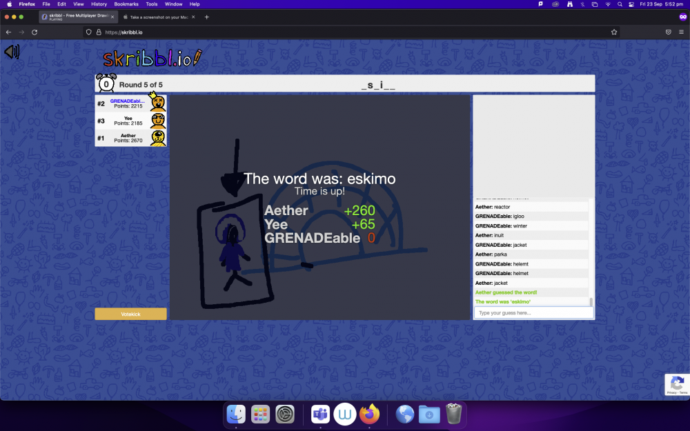 - In response to the theme “Play and Abstraction”. I hosted an event with Studio 1 class. We all played https://skribbl.io/ where you guess the word the person is drawing. It's like charades but you draw out the word instead of acting it out.