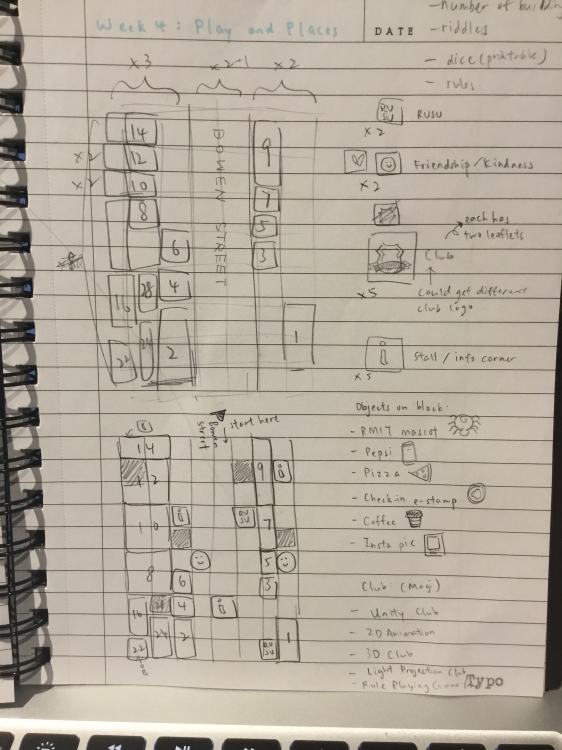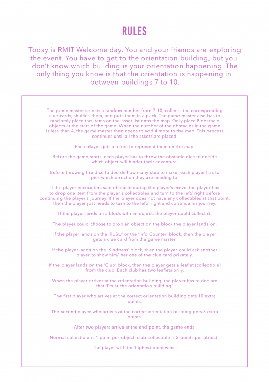 To explore 'Play and Place', I experimented with the idea of creating a board game. The process of creating a set of rules for a game is different. It's not like creating linear storytelling for animation, it's more like developing a gameplay flowchart for video games. There were a few takes before I created the final set of rules. The board game actually started off as a game that allows the player to explore the places by throwing the dice. It was just used to recreate the surprise and the fun of the exploration of the RMIT Welcome Day. Then, I thought about adding some competition into the game so that the player would not get bored during the play. Thus, the players get to collect items on their way while trying to beat each other in finding the right orientation building first. The board game I developed needs at least two players and one game master, therefore, I wasn't able to playtest the game at all. Hopefully, there won't be too much bug in the rules. I do hope that the people in the MAGI might be able to help with playtesting and I could further develop the game.