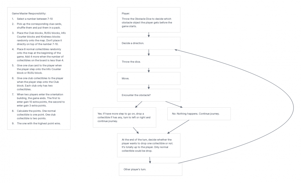 Then, I started building on the rule of 'changing direction when encountering a specific object'. The process of developing a set of rules was really unfamiliar to me. I tried my best to think about the board games that I enjoy and want to learn from them. I love the feature of 'getting clues and finding out the truth' from Cluedo, the way people could use chance cards against each other on Monopoly, and the collecting feature in Mario (not a board game). Therefore, I developed my own set of rules like below: