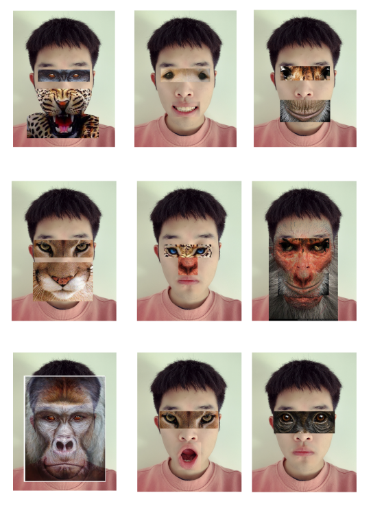 I’ve watched a video about swapping face in PShttps://www.youtube.com/watch?v=gOQ25Kp6jPY. So I attempt to swap two different face between a animal and my face. Not totally change, for example just use animals’ eyes to put on my face.this is not a suitable way through that video. It is more like Montage collage.But I can imagine if I had the eyes of a lion and the mouth of a rabbit. It may look like a monster and weird , but if people evolved from different animals, it seems to be amazing.