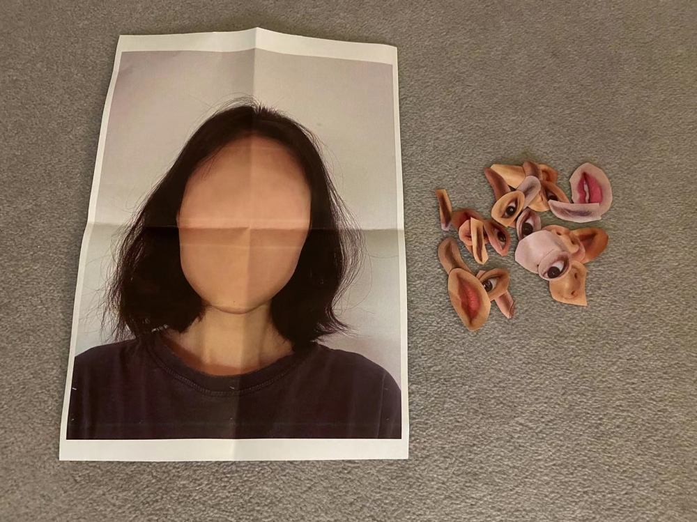 First, I took a selfie and removed the facial features in the photo by using Photoshop. Then I printed it and other images of stars and my friends. Cut out the facial features of each photo and mix them together. Next, I need to find my own facial features from it and put them together.