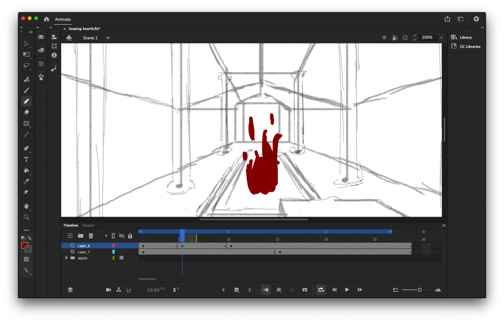 The transitional frames were really difficult because I am so used to animating people, creatures and characters in a way that is fantasy based or really surreal, using curved and looping lines. I wanted to try to animate with the lines and the planes of each of the locations which was initially difficult. I tried using the Pen Tool to focus on the lines solely, but this was limiting for me because the Pen Tool is technically hard to use. I deleted this and tried using the Pencil tool instead