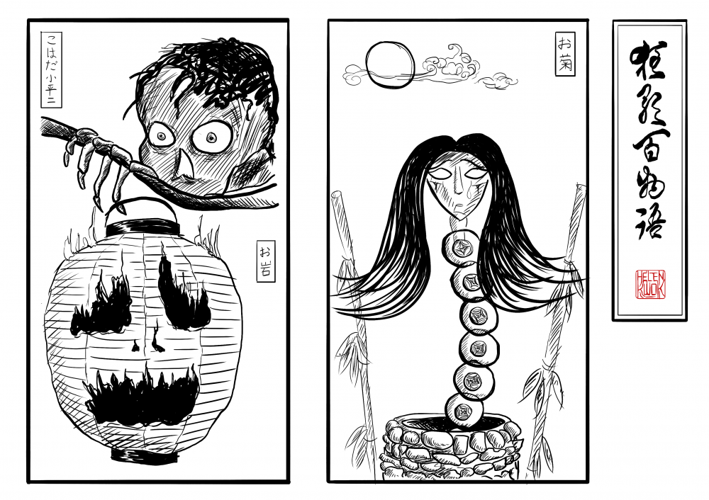 - Using the Poems on One Hundred Ghost Stories book as a reference, I traced the title and also used the pages within as reference images (main illustrations set inside a black border, each illustration labelled vertically in smaller boxes).