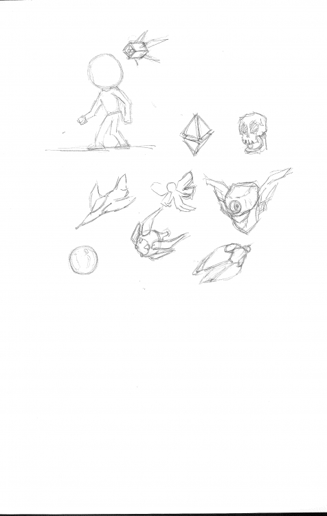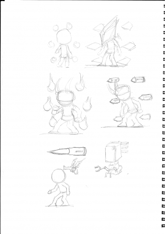 Response: At first concidering he/she is a shooter, thinking of he/she carries a gun. In the later process, I was thinking carrying a gun looks boring and in order to unlimit the thought of shooter needs to have a gun, I was thinking of having the character itself or a 3rd character as the gun. So there were sketches of pods, flying skulls, fairy etc.