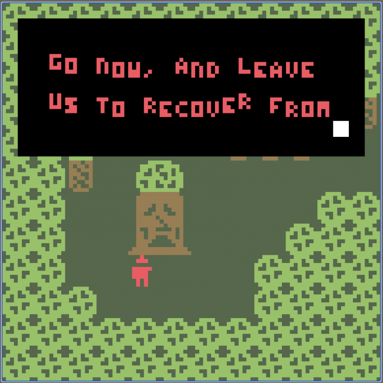 The game plays like a typical adventure game, requiring the player to navigate a labyrinthian forest, and find ways to overcome barriers that block their progress. Upon reaching the centre of the forest, the player discovers the Heart of the Woods, a gigantic tree that acts as the mouthpiece for the forest, which is sentient. The Heart of the Woods then admonishes the player for their actions, telling them that they don’t belong in the woods, that there’s nothing there for them, and that they need to leave. By subverting the typical climax of such a scenario (instead of discovering treasure or being rewarded for finding the centre of the woods), I’ve shown that the player is an intruder; and that the forest is a location that exists on its own terms, and doesn’t want to be trespassed upon like it has been.