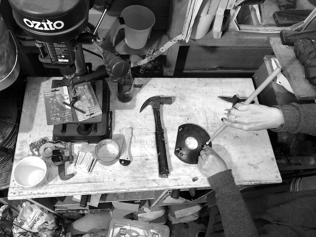 I took a multitude of pictures of the drumstick placed in different environments: in a box of paintbrushes, a table in a shed, in a kitchen pot, held next to a cello, and placed in a tree. I then edited the photos to touch up the lighting and colours, and also tweaked the saturation to produce black and white images.