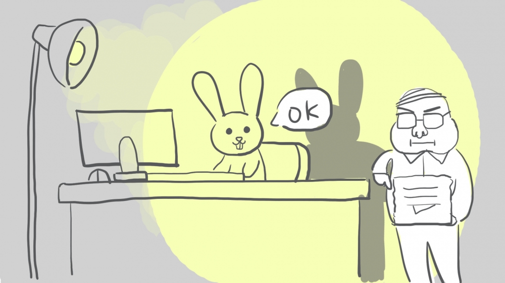 With this story as an inspiration, I used a rabbit as the main character of the animation because rabbits give an impression of obedient and mild-tempered. Only four colours were used in the animation to project a dull feeling. I used the grey colour as the background to give a depressed mood. White colour was used to give a cold feeling to the conversation bubbles. The yellow light drags the audiences’ focus and assist in the cowardice impression of the rabbit. I made the animation that focused on the shadow of the rabbit which reflects its psychological state. In the beginning, its shadow was just a rabbit. As the boss asked for more and more from it, a demon slowly grew in its heart. Music was manipulated to present the change in its psychological state.