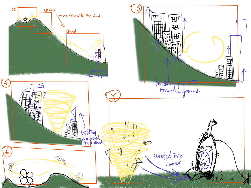By morphing the wind into a tornado which also acts as a symbolic effect of its anger and scare, I am trying to present It as feedback of the wind to the environment when it is trapped. It decided to swallow the buildings.