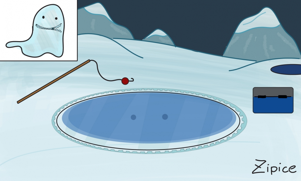 By creating a creature that has adapted to its environment and habitat through unzipping it’s body as a whole to carefully lay over the ice holes like a thin, see-through ‘net’ trap. Zipice catches unsuspecting humans and animals alike to eat, quickly zipping back up around them and swallowing its prey whole. I showed how it interacts and adapts to its environment, through placing its favourite hunting grounds on nearby fishing holes, taking advantage of the human presence in the otherwise frozen wasteland.