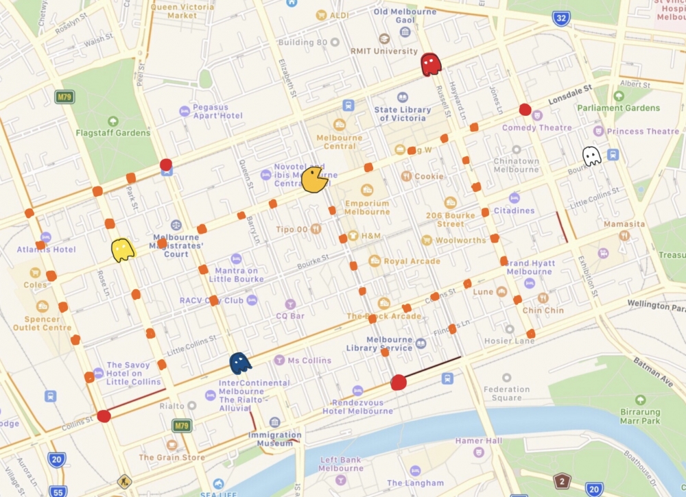 An image of a pacman map that use Melbourne CBD as a game map.