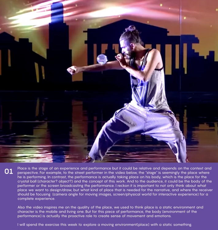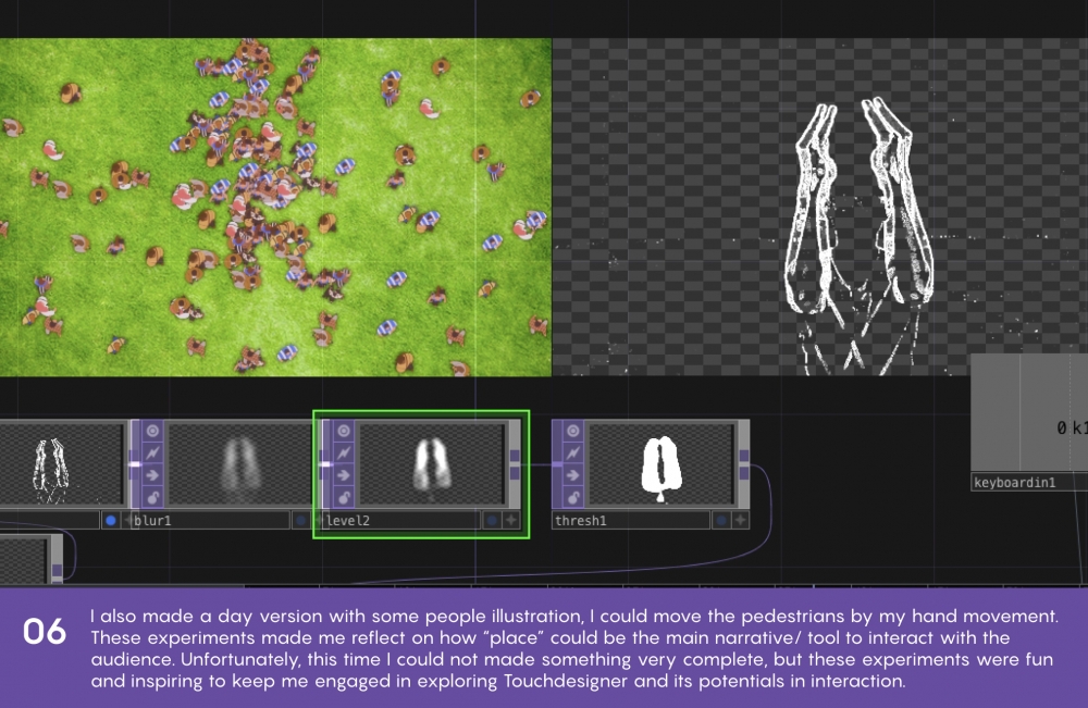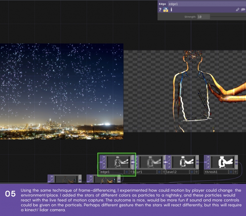 Experiment B: The Invisible Force By leveraging the motion detection channel I set up, I experimented the potential of enabling players to act as invisible force in the place. The place provided not only a stage and also limitation and imagination of the identities who the player is. In my experiments, player would be an star arranger in the night sky and angry wind who wants to mess with pedestrians. This shows that “place” could be the major interactable, connecting designated objects and players.