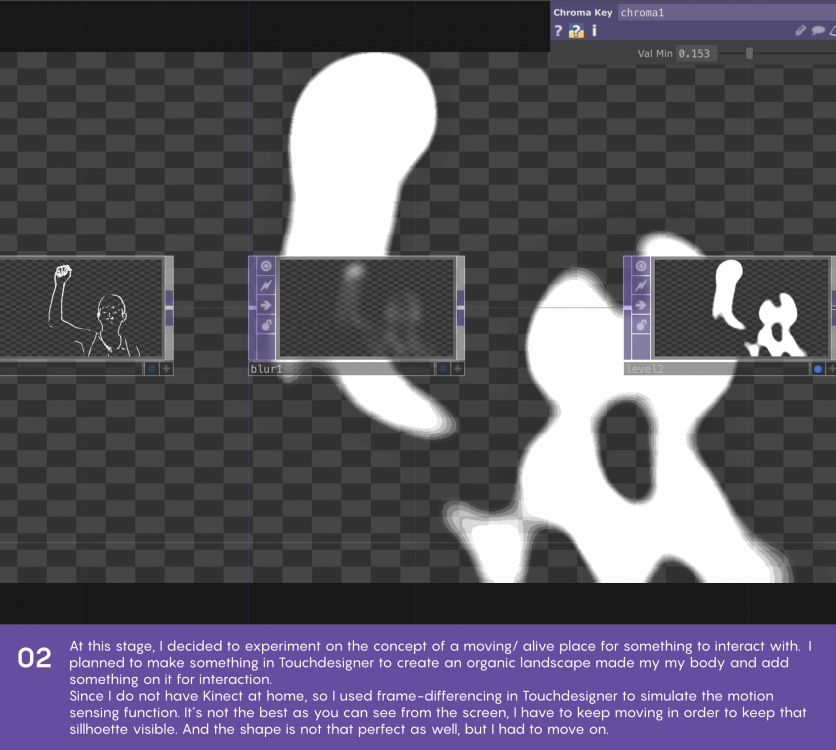 In response to the theme of discussion of place, I produced an organic landscape by motion detection using Touchdesigner. This week’s discussion of place made me contemplate on the role and qualities of environment.