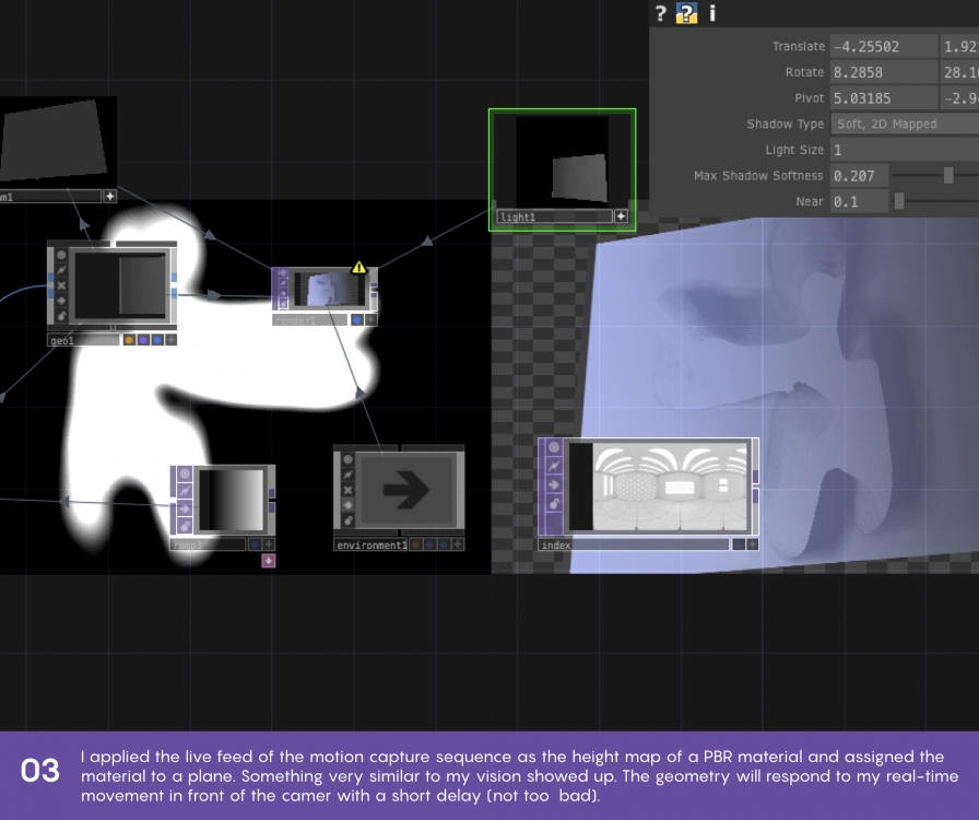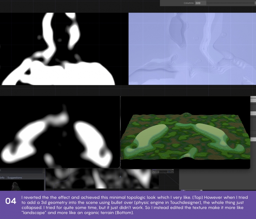 Experiment a: Organic Landscape By translating the motion detection (fram differencing) into meaningful data pass, I was able to feed this live data as the height map of a plane geometry so the plane would deform responding to my motion. I planned to make it interact with objects, however the physic system didn’t work out. Nonetheless, I still think it is a potential approach in game and interaction, imagining the place respond to player’s input and perform certain kind of changes. This proves that “place” itself could be in motion and organic even it’s not common in the real world.