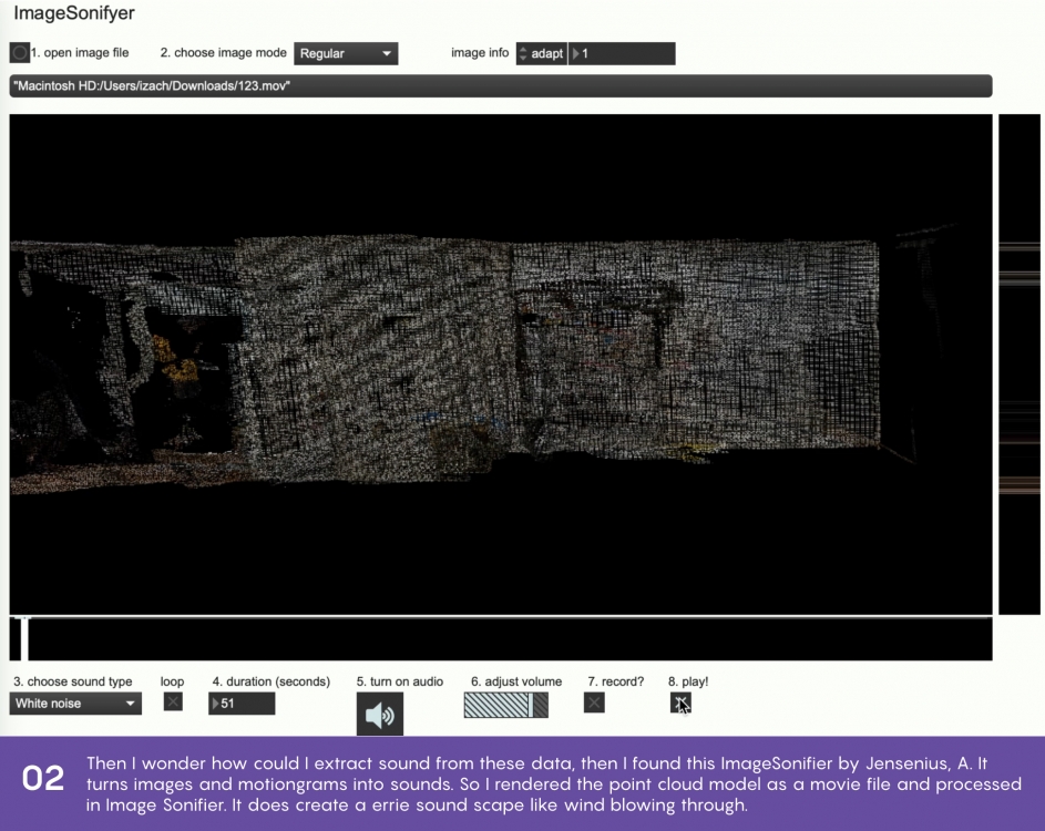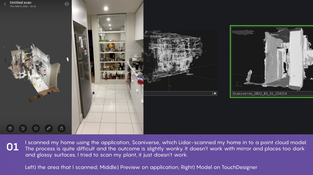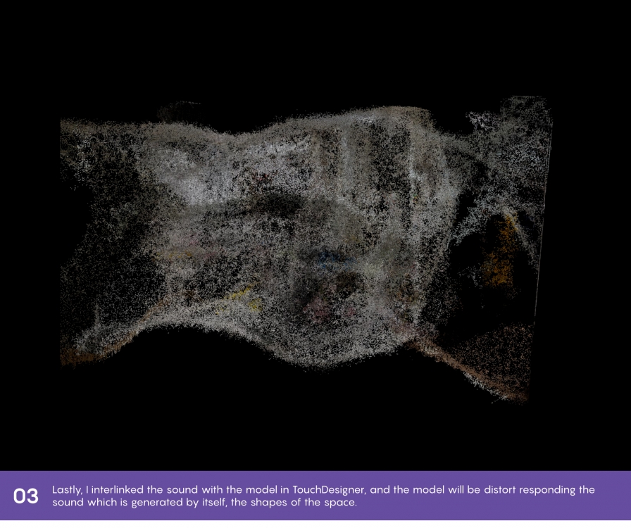 By scanning a part of my home into a point cloud model by using Scaniverse. I am able to turn the data into audio by using ImageSonifier(Jensenius, 2022), which basically just scans and analyses the RGB data and creates sound accordingly. Then I imported the audio into Touchdesigner and the point clouds to react with the sound made by its shape. I am imagining if I have an exhibitory area and technical capacity, I could set up a live Lidar scan of the area perhaps in timed intervals, and generate sounds out of the change of the point cloud (visitors come in/ they put down some objects), while the visualization will be put in the center of the room. The concept is that space is a passive object towards the active object, they have no say in what is coming in, but if we introduce agents of translation, by giving the voice to passive objects, hoping the audience could be more aware of these passive objects, especially the space. The reaction and sound will be very neutral, when there is change, the sole purpose is to remind the audience and reflect on themself what does the change mean, are there too many things inside, and why there is a response? This reflection I believe will remind visitors of the presence of other beings.