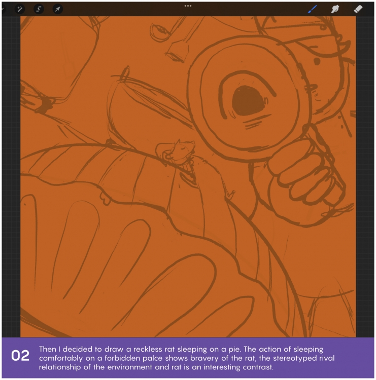 By creating the kitchen environment, and setting up the mice sleeping on the pie as a quilt, shows the audacity and recklessness of the mice. The contrast of a rat taking the kitchen as the home is the main thing I want to show here.