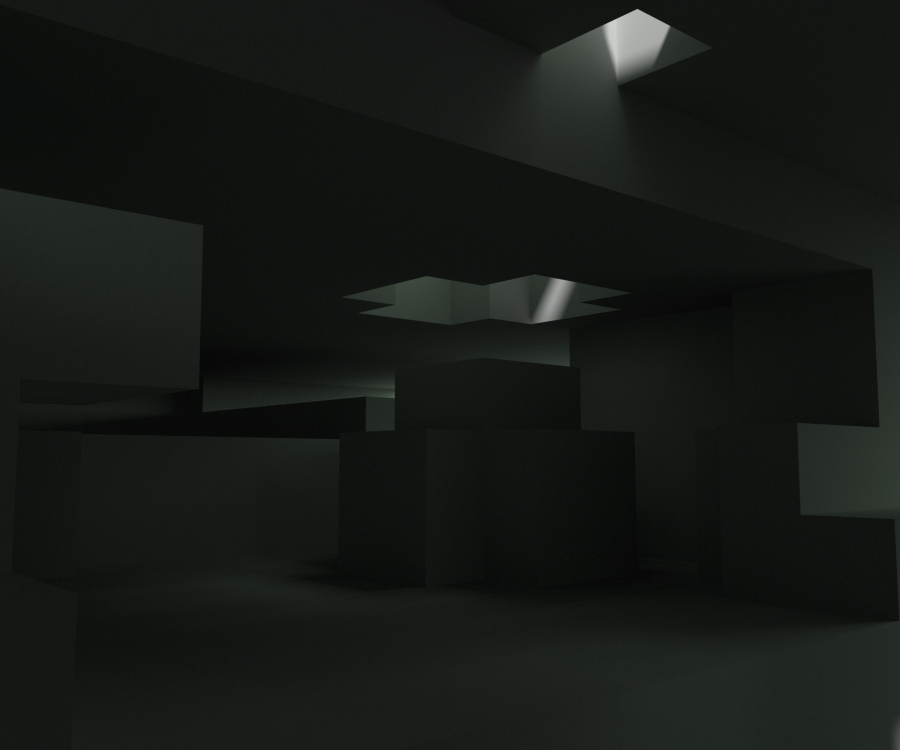 To create these structures I began with a solid cube, which I chipped away at and manipulated. The key was to not be precious about my shapes. I would experiment at first, shifting the form around and radically changing it over and over, before settling on a general shape and refining from that point. I would detail the structure, adding hallways, open walking areas and staircases to accomodate people. Finally I would render each object, altering the lighting to give each structure a specific hue to inform character (e.g. Object 2, a large, monumental structure is bathed in golden light, making it feel royal or holy).